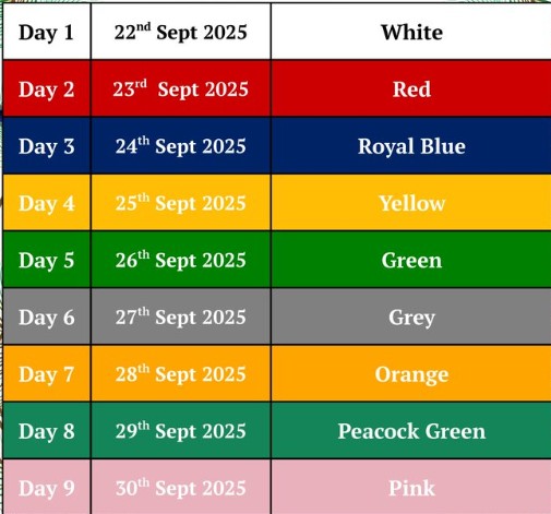 - बुधवार, २४ सप्टेंबर – रॉयल ब्लू (चंद्रघंटा): आपल्या कपाळावर चंद्र धारण करणाऱ्या चंद्रघंटा देवीची पूजा केली जाते. हा रंग शांतता आणि दैवी ऊर्जेचे प्रतिनिधित्व करतो.